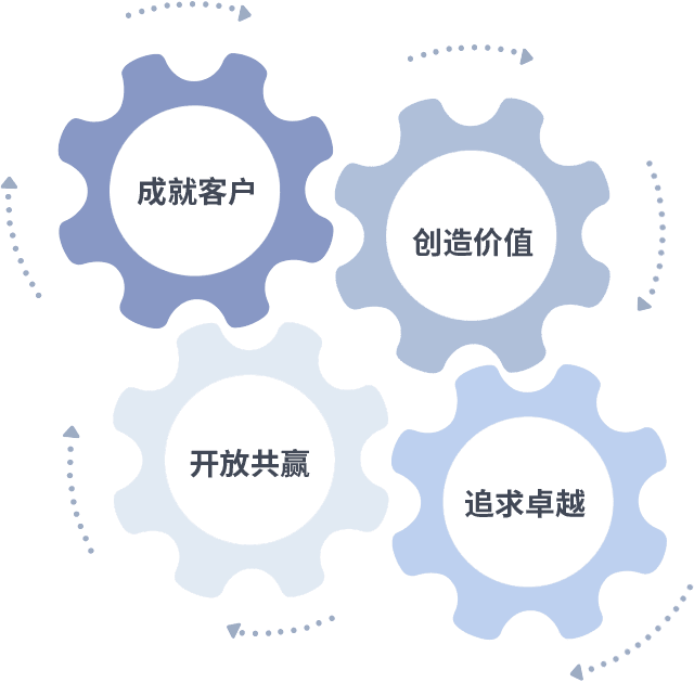成就客户是一切决策的出发点,,,创造价值是衡量所有工作的标准,,追求卓越是我们做事做人的态度,,,,开放共赢是我们的格局也是最终的结果。。。。价值观的齿轮环环相扣,,,推动着组织里的每个人不断向前。。