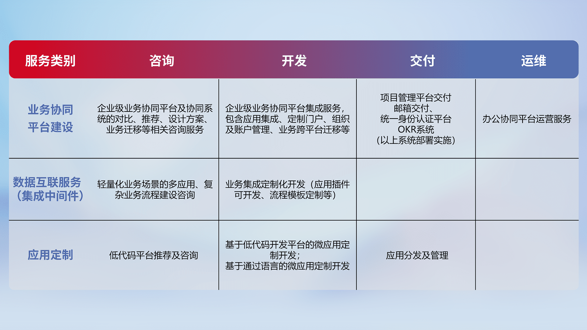 针对钉钉、、企微、、、、IDaas等平台级产品提供产品的规划、、、、方案、、、交付、、、、定制化开发等服务,,实现如统一协同办公、、、智能客户服务、、、混合会议管理、、智能数据查询、、等业务场景,,,,实现数字化转型。。。。